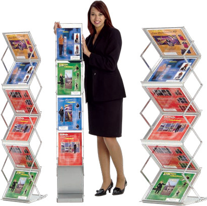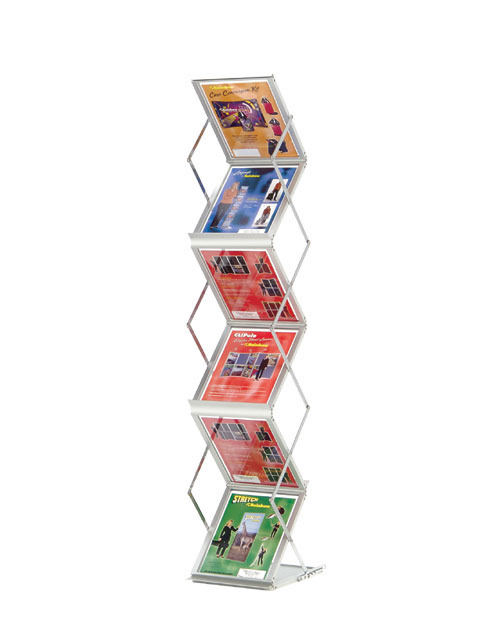 Skládací stojan na prospekty – plexisklový v kombinaci se stříbrným eloxovaným hliníkem se 6 kapsami na prospekty A4 nebo se 6 kapsami na A3 (respektive 12xA4).